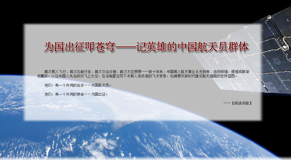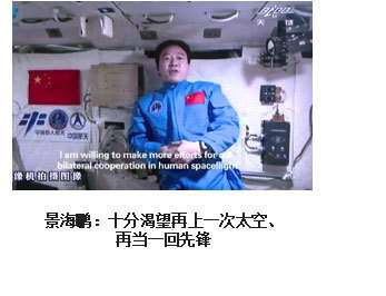 ??? 為了人類的和平與進(jìn)步,中國人來到了太空。2003年10月15日,我搭乘神舟五號(hào)飛船,在太空飛行14圈,歷時(shí)21小時(shí)23分,完成了中國首次載人航天飛行。雖然是獨(dú)自在太空飛行,但一想到億萬祖國人民翹首以待,我覺得不是一個(gè)人在飛。于是我拿起太空筆,在工作日志的背面寫上了這樣一句話:“為了人類的和平與進(jìn)步,中國人來到了太空”,并在艙內(nèi)鏡頭前向祖國人民、世界人民展示?!盀榱巳祟惖暮推脚c進(jìn)步”,是中國發(fā)展載人航天事業(yè)的初衷,“中國人來到了太空”既描述了一個(gè)歷史時(shí)刻,也表達(dá)了我為祖國航天事業(yè)感到無比自豪的心情。?