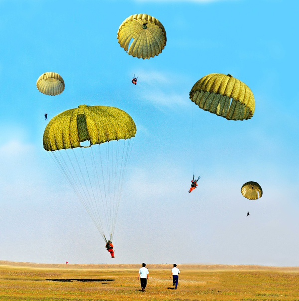 ????2001年6月,航天員在湖北進(jìn)行跳傘訓(xùn)練。新華社發(fā)(朱九通 攝)