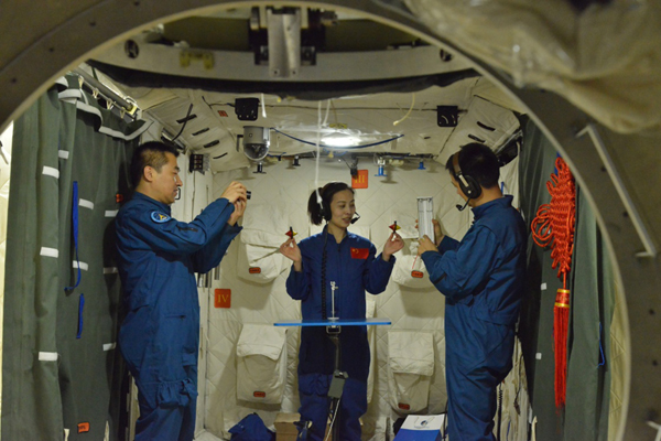 ????2013年5月22日,航天員王亞平(中)、聶海勝(右)、張曉光在模擬天宮一號組合體內(nèi)進(jìn)行太空授課訓(xùn)練。新華社發(fā)(朱九通 攝)