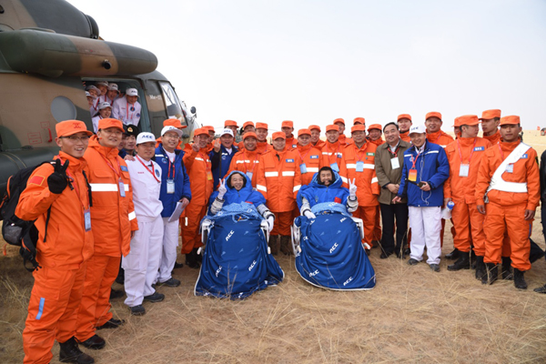 ????2016年11月18日,航天員景海鵬(左)、陳冬在四子王旗著陸場順利返回。新華社發(fā)(孔方舟 攝)