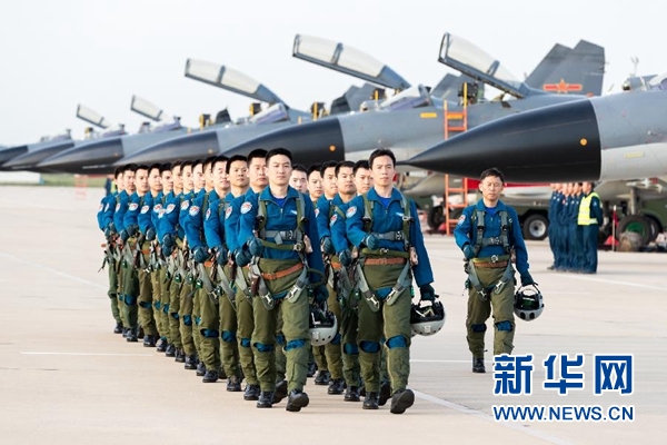 空軍“先鋒飛行大隊”飛行員列隊走向戰(zhàn)機(9月14日攝)。 新華社發(fā)(楊盼 攝)