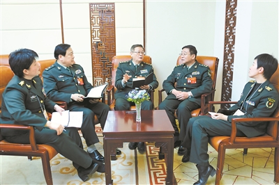 本報記者鄒維榮(左一)、柴華(右一)采訪軍隊政協(xié)委員曲新勇、王健、吳剛(左二至左四)。中國軍網(wǎng)記者 孫智英 攝