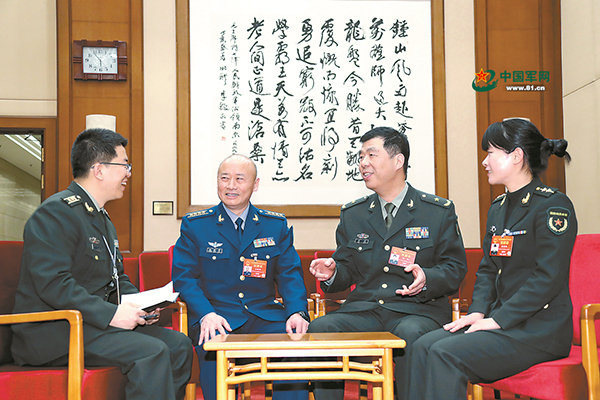 ????3月10日,解放軍報(bào)記者張軍勝(左一)采訪軍隊(duì)人大代表王獻(xiàn)軍、楊征、潘佳瑛(左二至左四)。解放軍報(bào)記者 穆可雙 攝