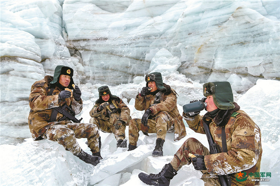 中途休息時(shí),官兵席地而坐吃干糧。