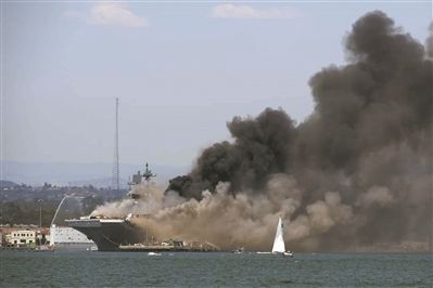 ????發(fā)生火災(zāi)后,處于撲救滅火狀態(tài)的“好人理查德”號兩棲攻擊艦。