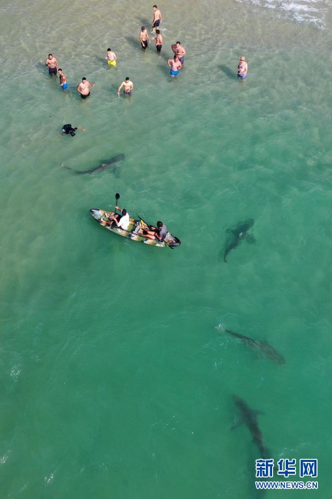 4月20日,在以色列北部城市哈代拉的海邊,鯊魚從人們身邊游過(無人機照片)。