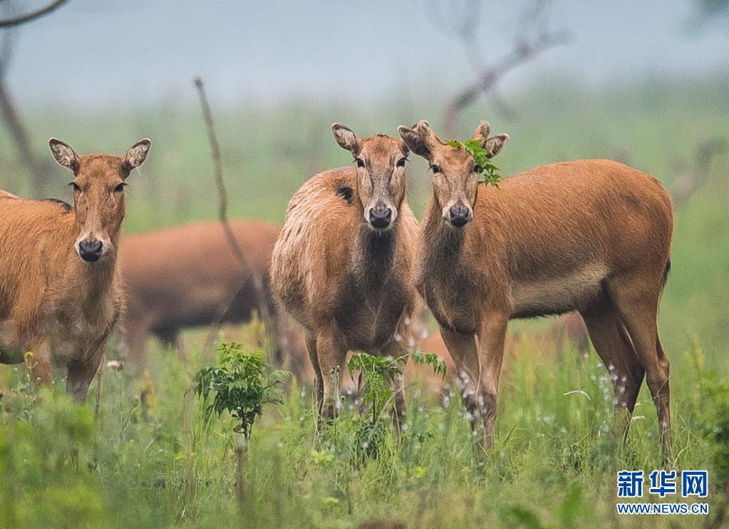 5月17日,一群麋鹿在石首麋鹿國家級自然保護(hù)區(qū)內(nèi)活動(dòng)。新華社記者 肖藝九 攝