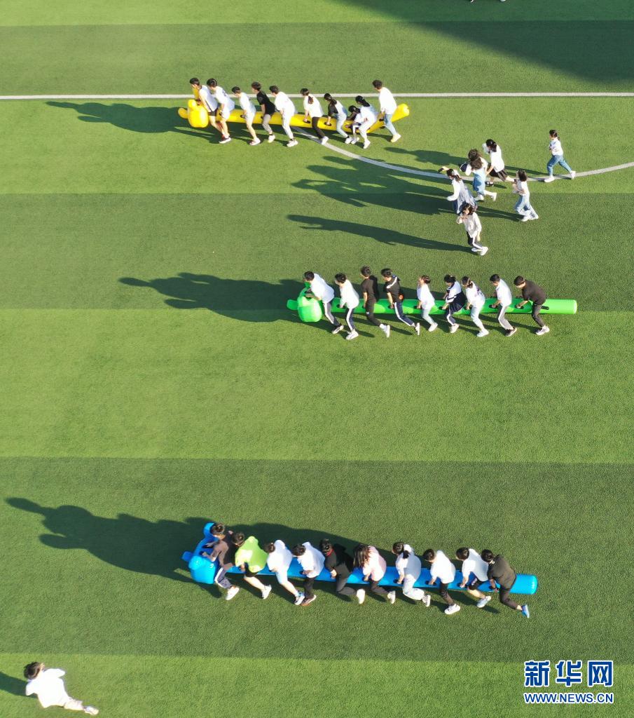 5月25日,湖南省永州市道縣第一中學(xué)的高三學(xué)生在做“同舟共濟(jì)”游戲(無(wú)人機(jī)照片)。