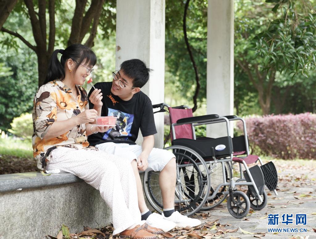 6月1日,趙建軍和母親在校園內(nèi)吃西瓜。新華社記者胡晨歡攝