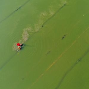 7月5日,在湖南省永州市道縣蚣壩鎮(zhèn)洲背村,村民在收獲小龍蝦(無人機照片)。