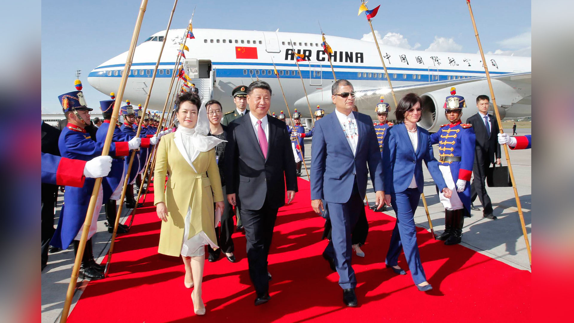 當(dāng)?shù)貢r(shí)間11月17日,國(guó)家主席習(xí)近平乘專機(jī)抵達(dá)基多,開(kāi)始對(duì)厄瓜多爾共和國(guó)進(jìn)行國(guó)事訪問(wèn)。厄瓜多爾總統(tǒng)科雷亞和夫人馬勒布等在機(jī)場(chǎng)熱情迎接習(xí)近平和夫人彭麗媛。新華社記者 鞠鵬 攝2016-11-18