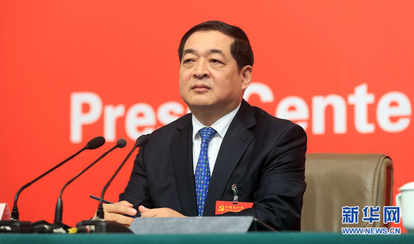 10月19日,十九大新聞中心舉辦集體采訪,邀請工信和通訊領(lǐng)域代表談走新型工業(yè)化道路。圖為山東省經(jīng)濟(jì)和信息化委員會黨組書記、主任錢煥濤。新華網(wǎng) 郝廣鵬攝