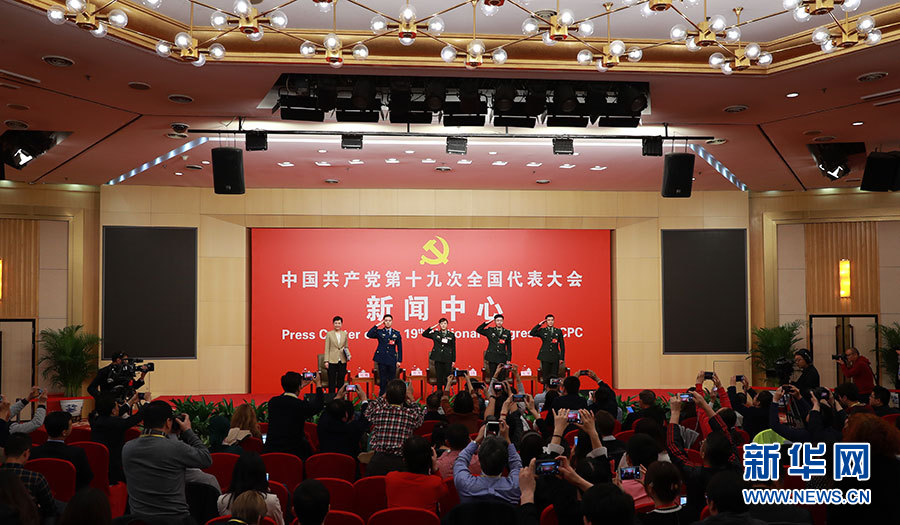 10月22日,十九大新聞中心在梅地亞中心二層新聞發(fā)布廳舉辦集體采訪活動,主題為“中國特色強軍之路邁出堅定步伐”。圖為集體采訪活動現(xiàn)場。新華網(wǎng) 郝廣鵬攝