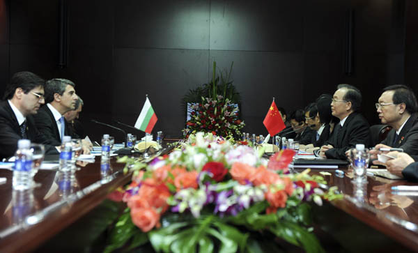 ??? 11月5日,中國國務院總理溫家寶在老撾首都萬象會見出席第九屆亞歐首腦會議的保加利亞總統(tǒng)普列夫內利耶夫。 新華社記者張鐸攝