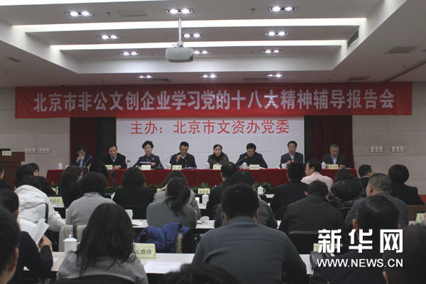 ?? 27日,北京市文資辦召開非公有制文化創(chuàng)意企業(yè)學(xué)習(xí)宣傳黨的十八大精神輔導(dǎo)報告會。圖為會議現(xiàn)場。新華網(wǎng)記者 陳元攝
