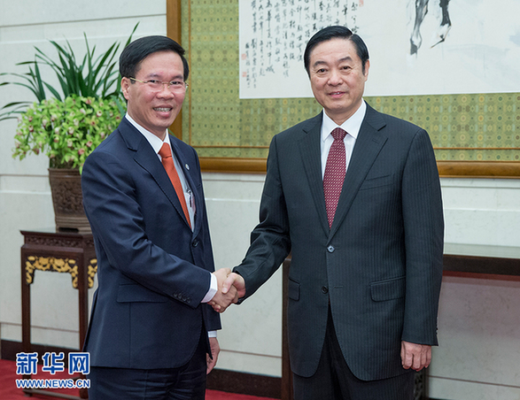 1月13日,中共中央政治局委員、中央書記處書記、中宣部部長劉奇葆在北京會(huì)見越共中央政治局委員、中央書記處書記、中央宣教部部長武文賞。新華社記者 崔新鈺 攝