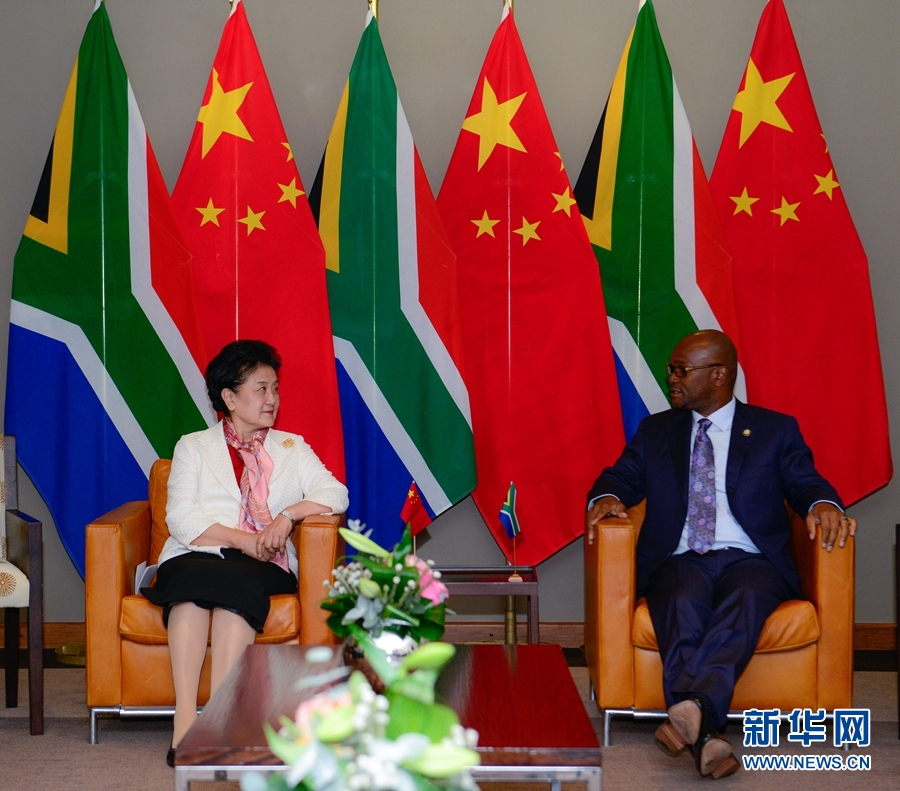 4月24日,中國(guó)國(guó)務(wù)院副總理劉延?xùn)|(左)在南非比勒陀利亞會(huì)見(jiàn)南非藝術(shù)和文化部部長(zhǎng)、中南高級(jí)別人文交流機(jī)制南方委員會(huì)主席姆特特瓦。新華社記者翟健嵐攝