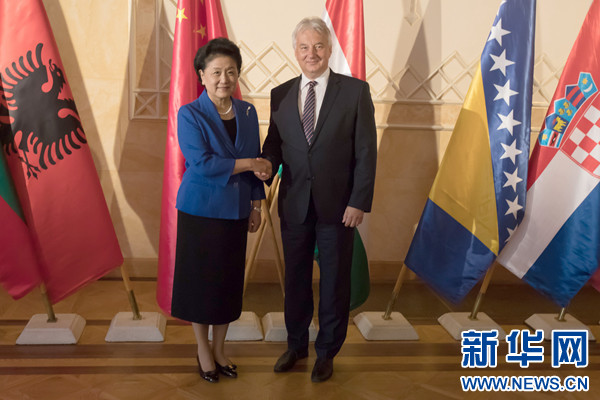 6月19日,在匈牙利布達(dá)佩斯,中國國務(wù)院副總理劉延?xùn)|(左)會(huì)見匈牙利副總理謝姆延。 新華社發(fā)(弗爾季·奧蒂洛攝)