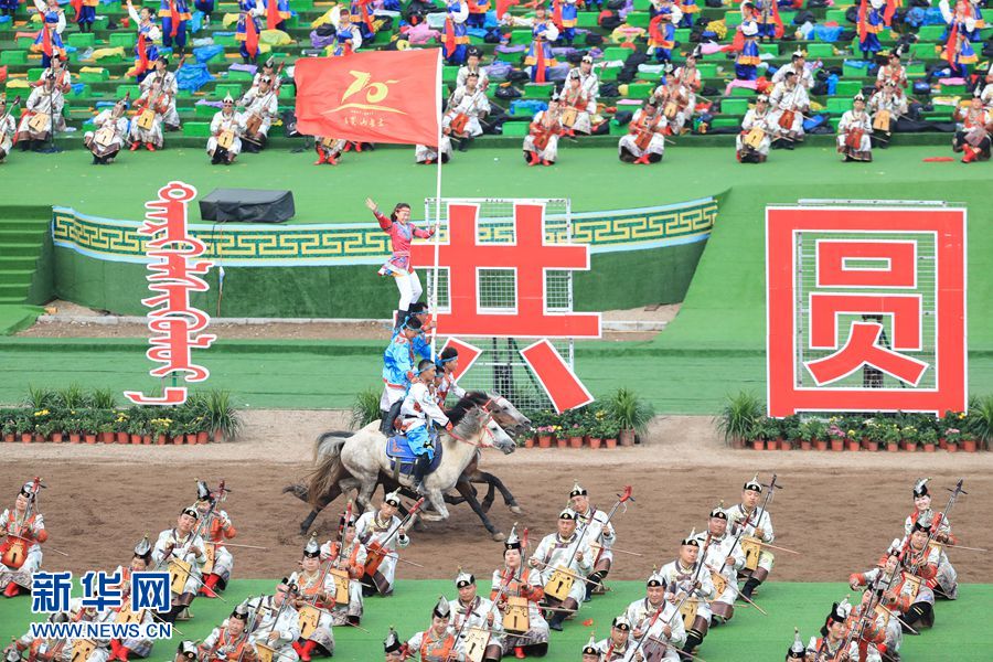 8月8日,內(nèi)蒙古自治區(qū)成立70周年慶祝大會在呼和塔拉內(nèi)蒙古少數(shù)民族群眾文化體育運動中心舉行。圖為群眾行進表演。新華網(wǎng)記者 陳杰 攝