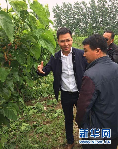 江蘇宿遷市宿城區(qū)埠子鎮(zhèn)蠶桑村黨支部書記周炳均(左)帶著村組干部、黨員和種植大戶30余人在徐州參觀果桑種植等項(xiàng)目(2017年5月4日攝)。新華社發(fā)