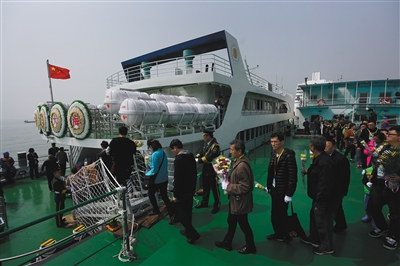 2018年4月2日,天津市濱海新區(qū)國際郵輪母港碼頭,全國首艘骨灰海撒專用船“國賓9號(hào)”首航,來自北京的逝者親屬們正排隊(duì)登船。新京報(bào)記者 王飛 攝