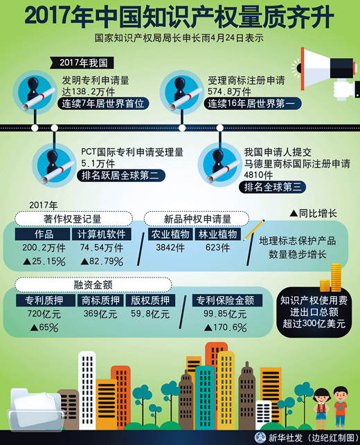 隨著中國(guó)經(jīng)濟(jì)迅速發(fā)展和創(chuàng)新能力的提高,加強(qiáng)知識(shí)產(chǎn)權(quán)保護(hù)愈加顯得迫切。對(duì)此,不僅外資企業(yè)有要求,中國(guó)企業(yè)更有要求。2017年,中國(guó)國(guó)家知識(shí)產(chǎn)權(quán)局共受理發(fā)明專(zhuān)利申請(qǐng)138.2萬(wàn)件,其中國(guó)內(nèi)申請(qǐng)超過(guò)90%;商標(biāo)申請(qǐng)量達(dá)到574.8萬(wàn)件,其中國(guó)內(nèi)申請(qǐng)量占到96.36%,顯示了國(guó)內(nèi)市場(chǎng)主體和創(chuàng)新主體對(duì)加強(qiáng)知識(shí)產(chǎn)權(quán)保護(hù)的強(qiáng)烈需求。