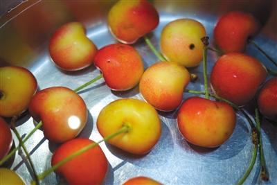 6月26日,鹽水浸泡中的櫻桃,沒(méi)有發(fā)現(xiàn)小蟲(chóng)子。新京報(bào)記者 王嘉寧 攝