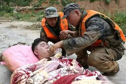 (7)2016年,“莫蘭蒂”臺(tái)風(fēng)后,官兵徒步深入災(zāi)區(qū),在半米深的泥石流和亂石堆中,抬著受傷人員與死神賽跑。一路八小時(shí),戰(zhàn)士們餓著肚子,把僅有的一瓶礦泉水留給了受傷群眾。有中國(guó)軍人的地方,就有依靠。