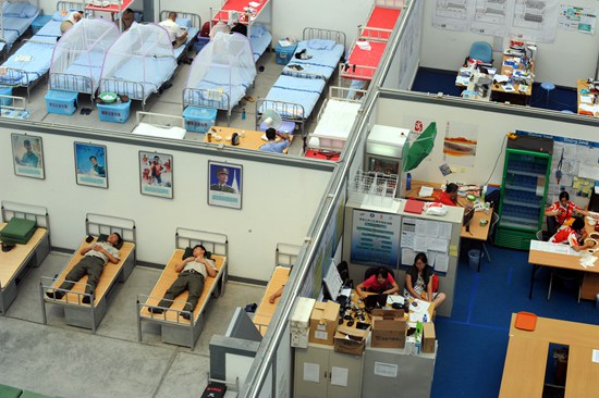 2008年8月17日,北京水立方游泳館,志愿者餐飲休息區(qū)。視覺(jué)中國(guó)供圖