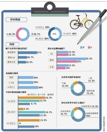 調(diào)查中,對于最喜歡的共享單車品牌(可多選),有57%的用戶表示喜歡摩拜,ofo小黃車也獲得了26.7%用戶青睞,23.3%的用戶喜歡小藍(lán)單車。