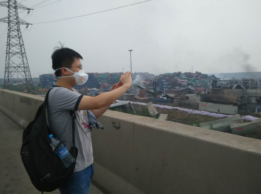 圖為2015年8月,李鯤在天津港“8·12”特大火災(zāi)爆炸事故現(xiàn)場附近拍照記錄現(xiàn)場情況。
