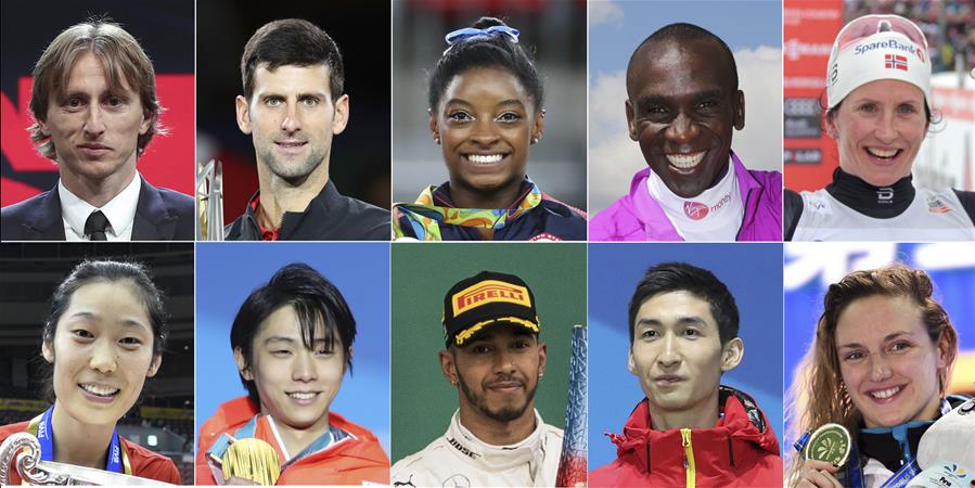拼版照片上排從左至右為:盧卡·莫德里奇、諾瓦克·焦科維奇、西蒙·拜爾斯、埃魯?shù)隆せ諉谈?、比約根;下排從左至右為:朱婷、羽生結(jié)弦、劉易斯·漢密爾頓、武大靖、霍蘇。 新華社發(fā)