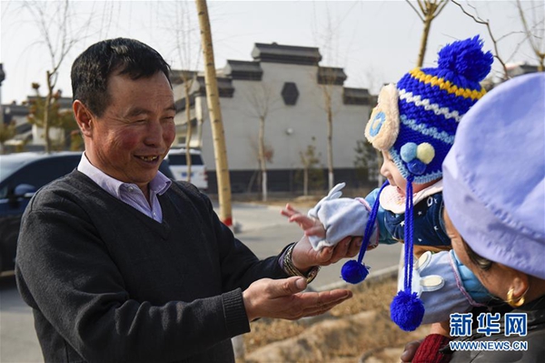 馬國(guó)權(quán)在潤(rùn)豐村的新家門(mén)前陪小孫子玩耍(2月18日攝)。新華社發(fā)(馮開(kāi)華 攝)
