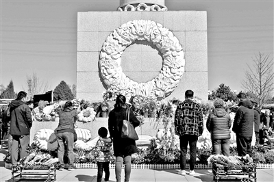 家屬手捧鮮花,在北京長青生命紀(jì)念園生態(tài)葬紀(jì)念碑前祭奠逝者 攝影/本報(bào)記者 魏彤