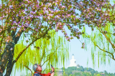 近日,北海公園西岸三十多年樹(shù)齡的西府海棠花開(kāi)正盛,綠肥紅瘦吸引市民前來(lái)觀賞。本報(bào)記者 鄧偉攝