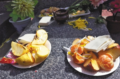 據(jù)其介紹,園方不會拿走祭品,但鮮花、水果等會腐爛,墓園的工作人員兩三天會清理一次。