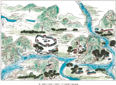 清代康熙年間的清遠(yuǎn)地圖, 用中國(guó)山水畫中的散點(diǎn)透視的技法繪制。