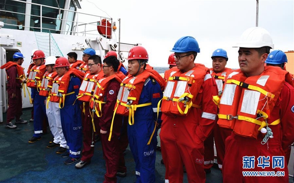 5月19日,科考隊(duì)員在甲板集合準(zhǔn)備登上救生艇。新華社記者 張旭東 攝