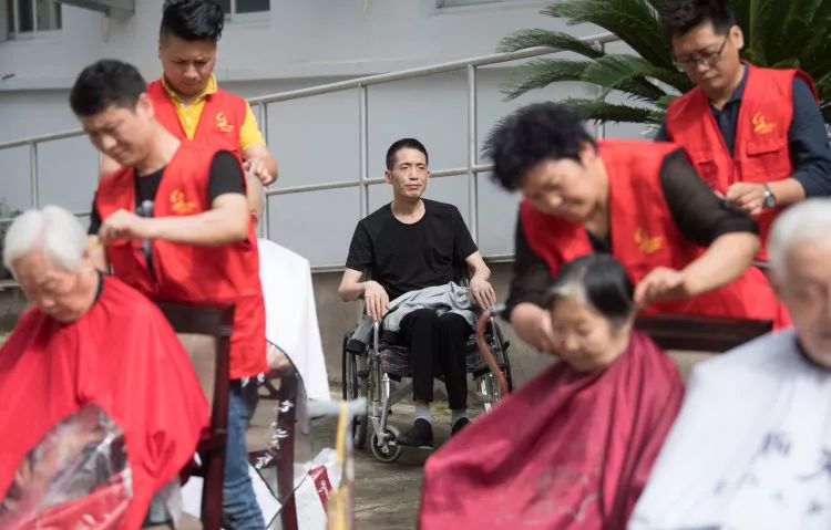 吳元渺愛心服務(wù)隊(duì)的志愿者們?cè)谂R海市一家養(yǎng)老院為老人義務(wù)理發(fā)。吳元渺坐在一個(gè)角落靜靜地看著他們。