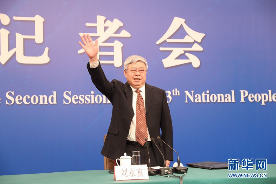 十三屆全國人大二次會議新聞中心于3月7日10時50分在梅地亞中心新聞發(fā)布廳舉行記者會,邀請國務(wù)院扶貧開發(fā)領(lǐng)導(dǎo)小組辦公室主任劉永富就“攻堅克難——堅決打贏脫貧攻堅戰(zhàn)”相關(guān)問題回答中外記者提問。圖為劉永富向記者們揮手示意。新華網(wǎng) 陳杰 攝