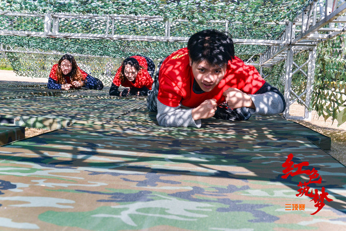 上午九時,一支隊伍正合力將長繩和70面國旗串聯(lián)懸掛至旗海中,讓人聯(lián)想起第一面五星紅旗在開國大典廣場上飄揚(yáng)的場景;另一支隊伍的幾位隊員正用PVC管作為連接,合力吹氣將5個氫氣球吹爆,這是在通過游戲的形式致敬1967年的第一顆氫彈爆炸成功;還有一群隊員穿著救生衣、膠鞋扛著自己的隊友穿越洪水區(qū)、獨(dú)木橋區(qū)、沼澤地區(qū),還原98 年抗洪搶險、5.12抗震救災(zāi)的場景……