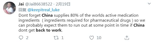 推特用戶Jai說:不要忘了中國供應(yīng)著全世界80%的活性藥物成分,因此如果中國不復(fù)工復(fù)產(chǎn),它們可能會在某個時間點(diǎn)用完。