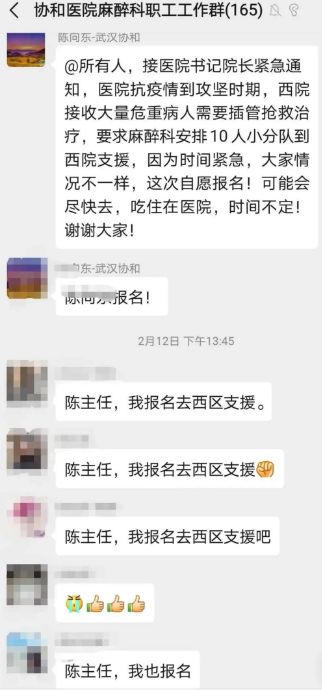 “緊急通知!醫(yī)院抗疫情到攻堅(jiān)時(shí)期,西院接收大量危重病人需要插管搶救治療,要求麻醉科安排10人小分隊(duì)到西院支援。時(shí)間緊急,大家自愿報(bào)名”。這是2月12日上午陳向東在工作群里發(fā)出的醫(yī)院緊急通知。