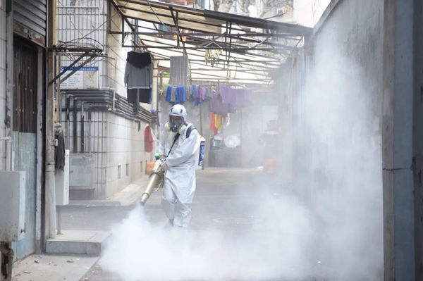2月5日,長(zhǎng)沙藍(lán)天救援隊(duì)隊(duì)員在長(zhǎng)沙市馬王街社區(qū)內(nèi)消毒殺菌。新華社發(fā)(陳振海攝)