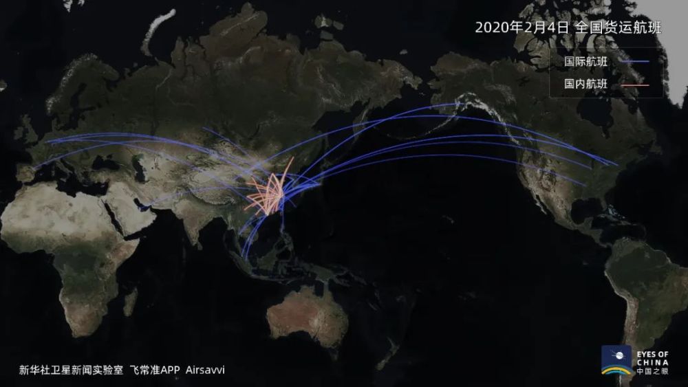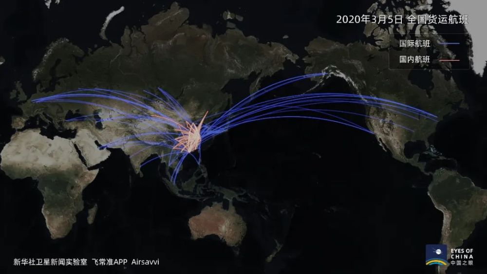 1個(gè)月內(nèi),中國(guó)國(guó)內(nèi)和直飛世界各地的貨運(yùn)航班快速增多,原有航線航班數(shù)也有增加,標(biāo)示航線的橘色、藍(lán)色線條也就更粗。