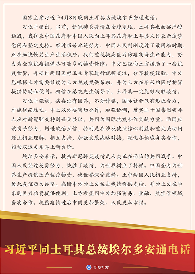 新華社北京4月8日電? 國(guó)家主席習(xí)近平8日晚同土耳其總統(tǒng)埃爾多安通電話。