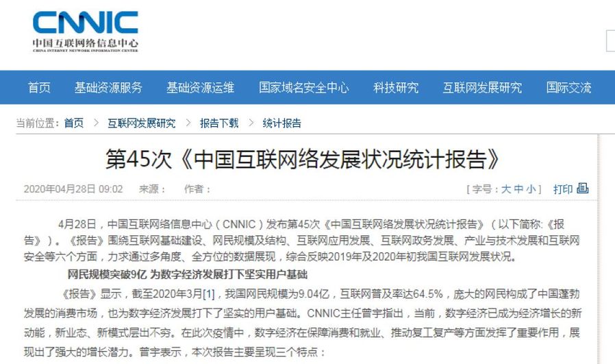 4月28日,中國(guó)互聯(lián)網(wǎng)絡(luò)信息中心(CNNIC)發(fā)布第45次《中國(guó)互聯(lián)網(wǎng)絡(luò)發(fā)展?fàn)顩r統(tǒng)計(jì)報(bào)告》(以下簡(jiǎn)稱(chēng):《報(bào)告》)?!秷?bào)告》圍繞互聯(lián)網(wǎng)基礎(chǔ)建設(shè)、網(wǎng)民規(guī)模及結(jié)構(gòu)、互聯(lián)網(wǎng)應(yīng)用發(fā)展、互聯(lián)網(wǎng)政務(wù)發(fā)展、產(chǎn)業(yè)與技術(shù)發(fā)展和互聯(lián)網(wǎng)安全等六個(gè)方面,力求通過(guò)多角度、全方位的數(shù)據(jù)展現(xiàn),綜合反映2019年及2020年初我國(guó)互聯(lián)網(wǎng)發(fā)展?fàn)顩r。