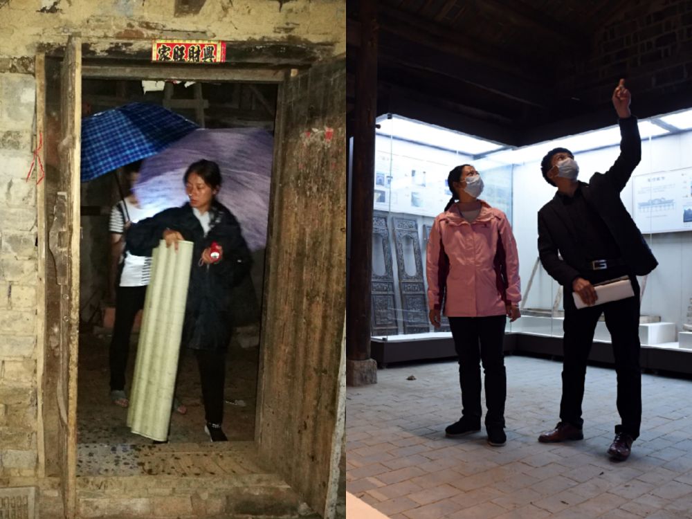 (左圖:2017年7月的一場大暴雨中,大灣村第一書記余靜轉移危房中群眾,新華社記者陳諾攝;右圖:2020年3月19日,大灣村在建農俗博物館內,余靜(左)和施工人員交流。新華社發(fā)周牧攝)