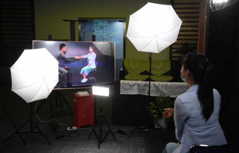 ↑本場(chǎng)訪談是新華社首次采用5G傳輸加全息成像技術(shù)進(jìn)行采訪,使全國人大代表和主持人即使相隔千里也能實(shí)現(xiàn)“面對(duì)面”的交流。這是全國人大代表程桔在武漢演播室伸手,與北京的主持人高熹“云握手”。新華社記者 程敏 攝