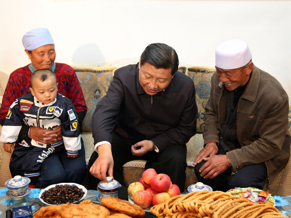 (2008年4月8日,習近平在固原市原州區(qū)開城鎮(zhèn)深溝村考察新農村建設情況時看望回族農民金學文一家,并在農民家品嘗當?shù)氐纳w碗茶。新華社記者蘭紅光攝)